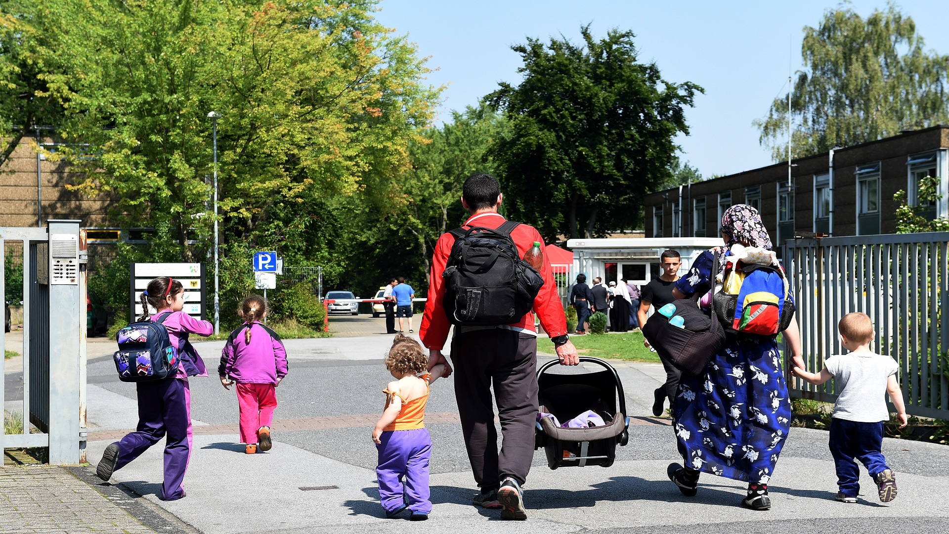 Asylum-seekers walk in to a refugee reception facility in Dortmund, Germany, on August 13, 2015. The overcrowded facility in Dortmund has seen the largest influx of refugees in years throughout the course of the week. According to head of the facility, 997 refugees arrived on Monday. The facility provides shelter to 300 refugees, with an additional 50 spots reserved for emergency cases. AFP PHOTO / PATRIK STOLLARZ (Photo credit should read PATRIK STOLLARZ/AFP/Getty Images)