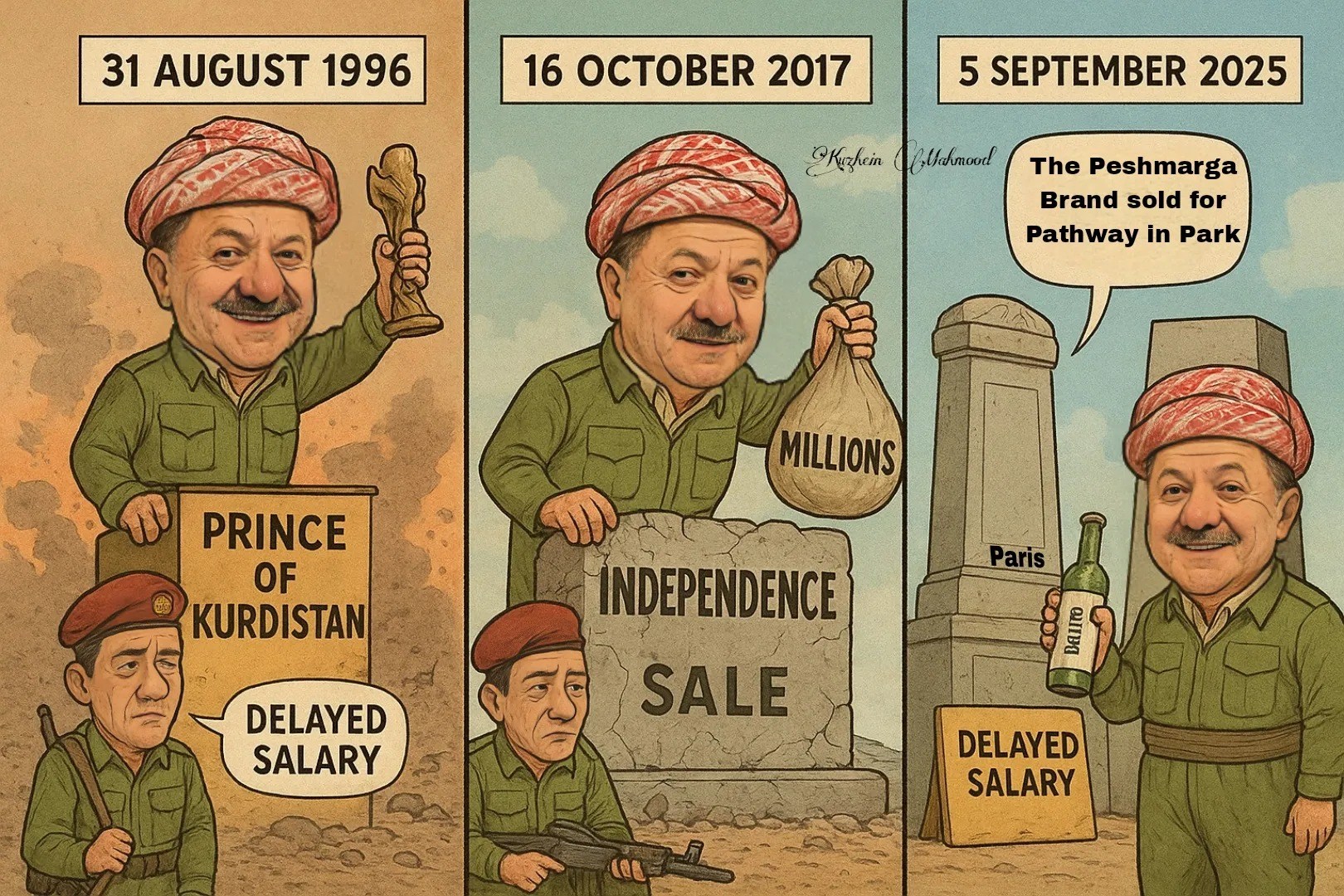 لە ١٩٩١ تا ٢٠٢٥، مەسعوود بارزانی هەوڵیداوە ھەر «دەستکەوتێکی سەقەت و شکست» بکات بە «موزایەدە» بفرۆشێتەوە: ٣١ی ئابی ١٩٩٦ بە ناوی «پاراستنی کوردستان»، ١٦ی ئۆکتۆبەری ٢٠١٧ بە ناوی «سەربەخۆیی»، و ئێستا ٥ی ئەیلوولی ٢٠٢٥ بە ناوی «پێشمەرگە». بەڵام ئەوەی کە ھەمیشە لە پشت ئەم «موزایەدە»یەوە دەمێنێتەوە لە دونیایى مۆدێرنى پێشکەوتوودا، تەنها «پاڵەوان» نییە، بەڵکو «پاڵەوان»ی پارەشە. کاتێک وەزارەتى دارایی دەڵێت «بودجە نییە»، بەڵام مەسعوود ٣,٧ ملیۆن یورۆی بۆ «تولەڕێ» سەرف دەکات دەبێت بپرسین ئەمەت لە کوێ هێنا چونکە دڵنیام پارەى حیزبەکەت نییە ئەوە پارەى میلەت و حکومەتە کە کوڕە ئێکسپایەرەکەت لەسەر دەسەڵات.